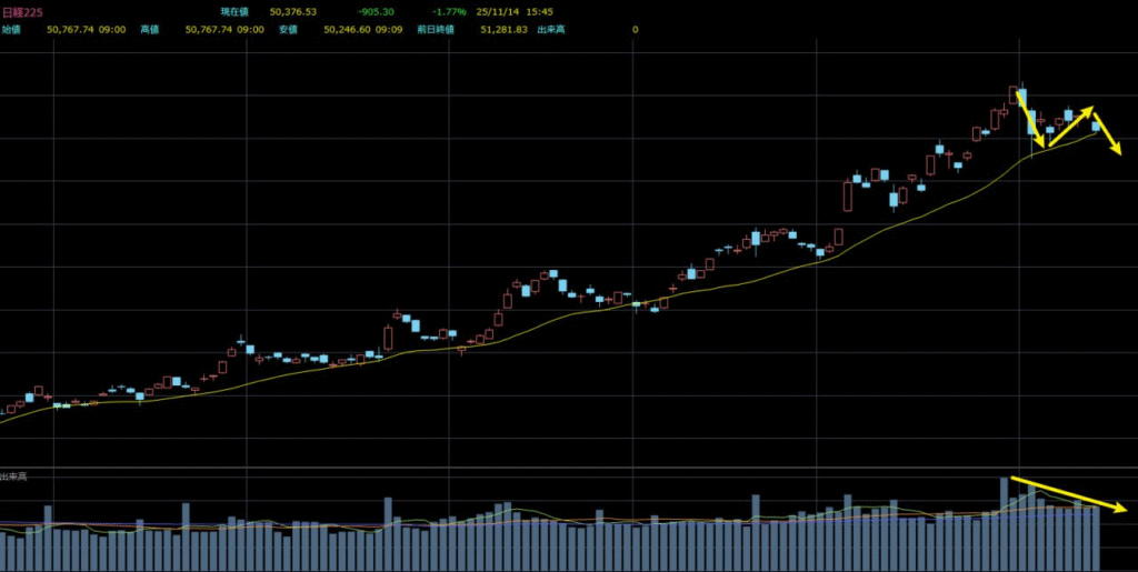 現在の日経平均は、すでに過去35年の中でも高値圏に位置しており、直近の値動きでも明確な調整局面入りの兆しが見えています。テクニカルの観点から判断すると、日経平均はここから本格的な調整に入る可能性が高く、その意味でも来週の日経平均の基本的な想定は「下方向への推移」となります。