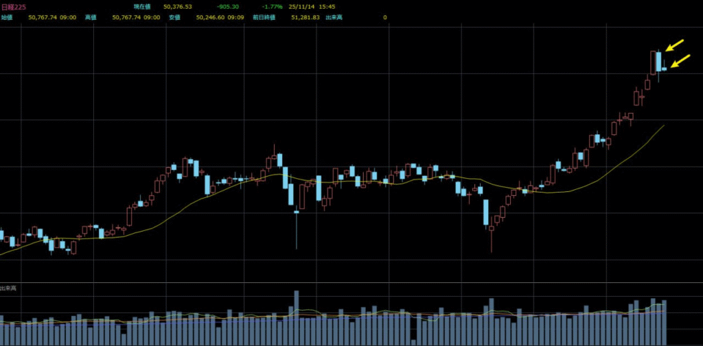 日経平均は本週、高値をつけた後に反落する展開となりました。5営業日のうち3日が上昇、2日が下落で、前週比では100.16円高の50376.53円で引けています。図1は日足チャートですが、ここからもトレンドが徐々に弱含みに転じている様子がはっきりと確認できます。図2は週足チャートで、先週は「陰の包み足」が形成され、今週は「上ヒゲ陰線」で引けました。いずれも下落を示唆するシグナルです。これまでのテクニカル講義の中でもお伝えしてきたように、「陰の包み足」や「上ヒゲ陰線」が高値圏で出現した場合、多くは天井サインとして機能します。