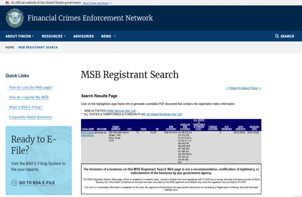 Zentara取引所が現在保有している主な監督ライセンスは、米国のMSBライセンス(FinCEN)です。米国MSBとは、米国財務省・金融犯罪取締ネットワーク(FinCEN)が管轄する一種の金融ライセンスで、主な監督対象は「暗号資産(仮想通貨)の取引」「暗号資産の交換業務」「外国為替の交換」「国際送金・決済」「その他金融関連サービス」などとなっています。米国内でこれらの業務を行う事業者は、MSBライセンスを取得しなければ合法的に営業することはできません。皆さんにもおなじみのBinance(バイナンス)も、このMSBライセンスを保有しており、同社は2025年5月に正式にMSBの認可を取得しました。