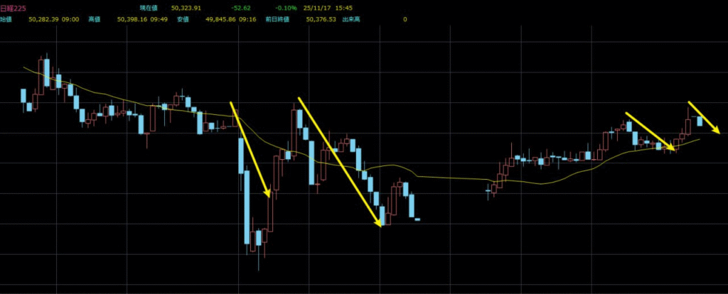 寄り付き直後は、中国と日本の関係悪化に関する報道を受けた警戒感から売りが先行し、インバウンド関連銘柄にはまとまった売りが出て、安値は49845.86円まで下落しました。
