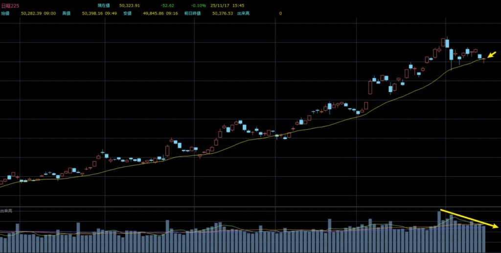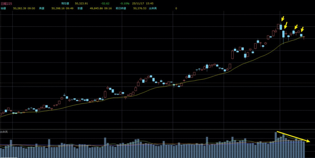 高値圏での出来高減少は、力強い上昇にはつながりにくく、むしろ上昇トレンドが息切れしつつある典型的なパターンです。