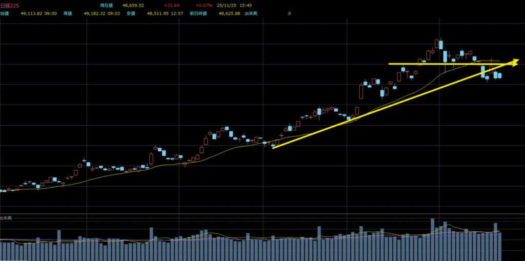 こうした要因が重なり、足元の日本株市場では上値の重い展開と戻り売り優勢の流れが続いている状況です。