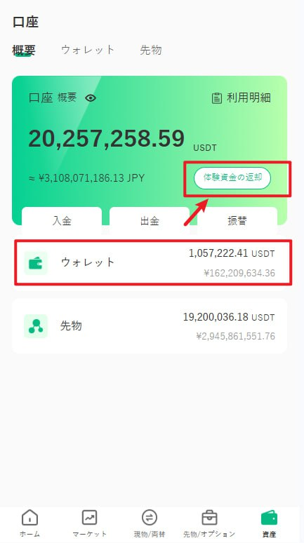 ここから600ドルの体験資金を返却するために、まず画面上部の「体験資金の返却」をタップしてください。