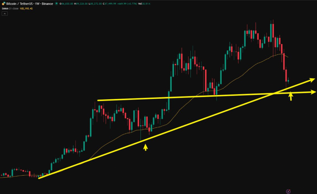 週足チャートで見ると、全体の上昇トレンドは崩れておらず、現在の価格調整局面では、ちょうど上昇トレンドラインまで押し目を付けてサポートを確認した形になっています。