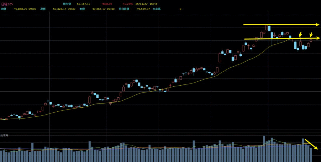 出来高の減少が続いていることは、短期的なリスクが高まりやすく、上値余地も限定されやすいことを意味します。