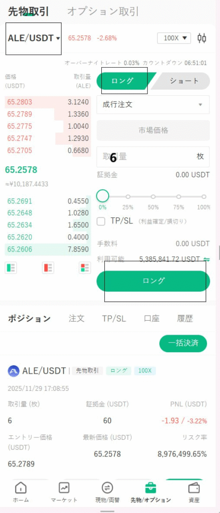 1枚あたりの証拠金が10USDTであれば、5万USDT ÷ 10USDT で、合計5000枚まで発注できる計算になります。