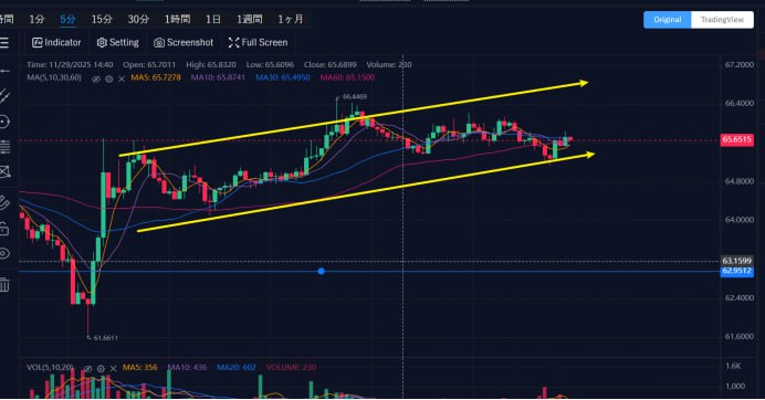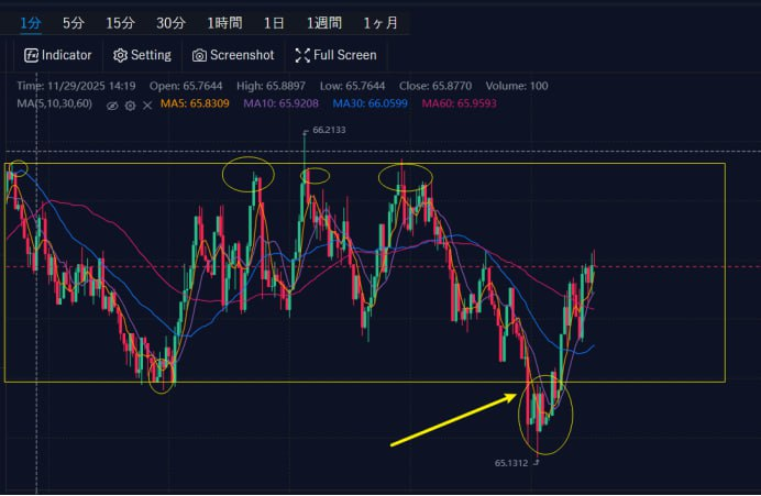 私たちは65.2付近でロングエントリーし、65.7付近で利益確定を行い、最終的に60%を超える利益を達成しました。