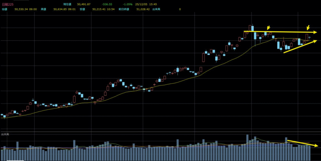 現在の市場参加者は、FRBの利下げ期待と日銀の利上げ観測という二つの影響を受け、積極的な買いを控える姿勢で、高値圏では戻り売りを選択する傾向が強くなっています。