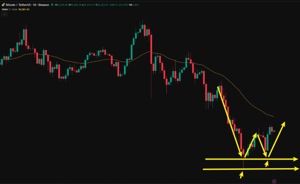 次に テクニカル面 を見ると、図のように、ビットコインは前の重要なサポートラインへ戻した後に上昇へ転じています。