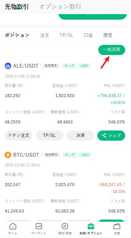 BTCの値動きはあまりなかったので、よりボラティリティの大きい ALEを狙って、ロングして取引しました。