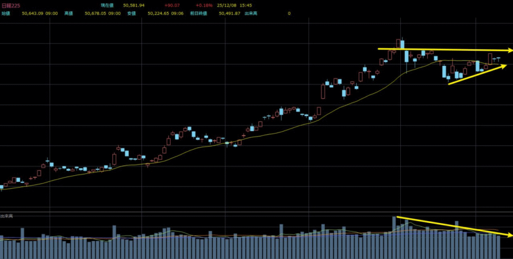 日足チャートを見ると、日経平均は短期的な上昇トレンドに入ったように見えますが、よく観察すると、出来高は以前と比べて大きく増えていません。