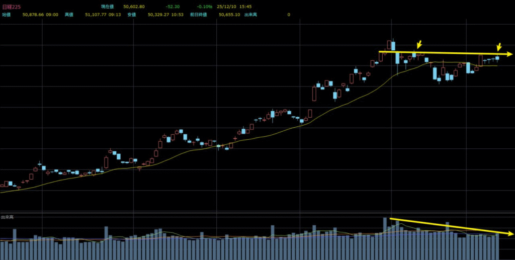 午後には円安の動きが出たことでわずかに買いが入り、日経平均は小幅に反発しましたが、最終的には50,602.80 円で引け、前営業日比 52.30 円安、下落率0.10%となりました。