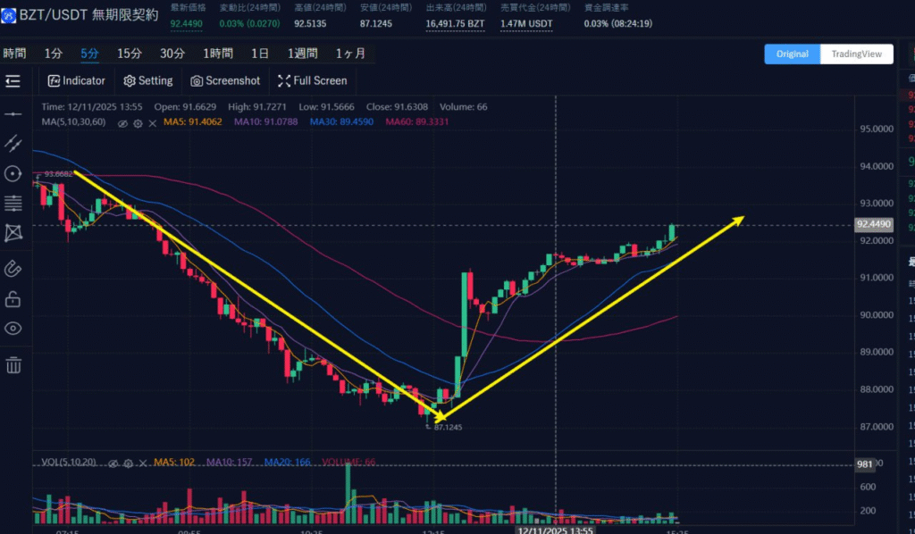 今の相場状況を見ると、1 分足でも5分足でも、すでに明確に上昇トレンドへ転換しています。