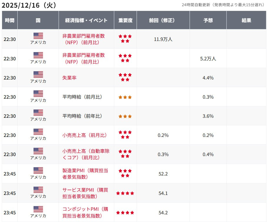 そのため、来週市場の注目ポイントは、16日に発表される米国11月の雇用統計および10月の小売売上高、18日に発表される米国11月の消費者物価指数(CPI)、そして19日に発表される米国11月の個人所得・個人消費支出(PCE)データです。