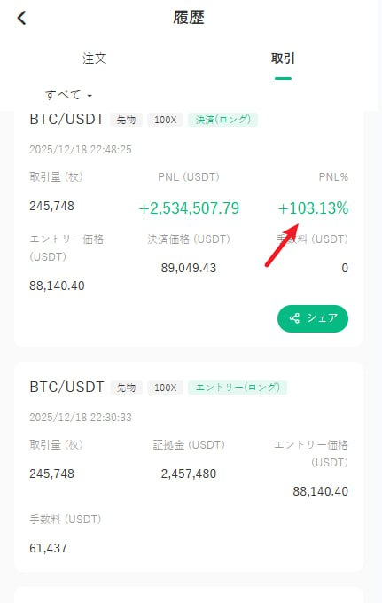 今回はロングだけでなく、初動の大幅上昇後、まだ市場に残っていたメンバーに対してショートの指示も行っています。その結果、2回の取引を合わせた収益率は170.78%となりました。