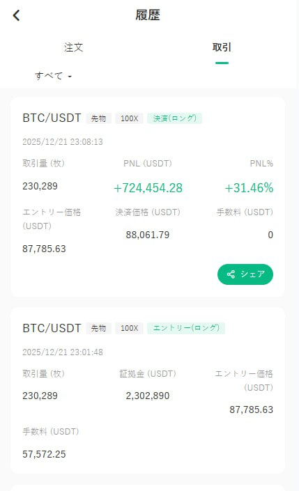 最初の取引は22:24にビットコインのショート注文であり、相場は予想通りに展開し、この注文は約29%の利益で終えました。