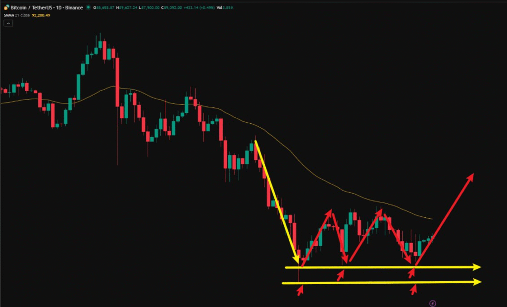 そのような状況の中、チャートに示している通り、ビットコインは安値圏でレンジを形成しながら底固めの段階に入り、下値ではトリプルボトムの構造が確認できます。