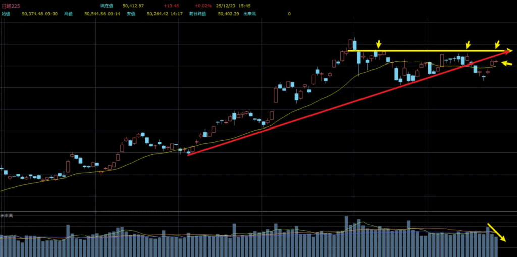 また、出来高が継続的に減少している中で、この十字線は連騰による資金の買い疲れを示しており、市場が調整局面へ入る可能性を強く示唆しています。