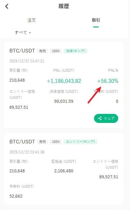 昨夜は非常に良い取引となり、ビットコインで2回のロングエントリーを行い、合計で77%の収益を上げることができました。