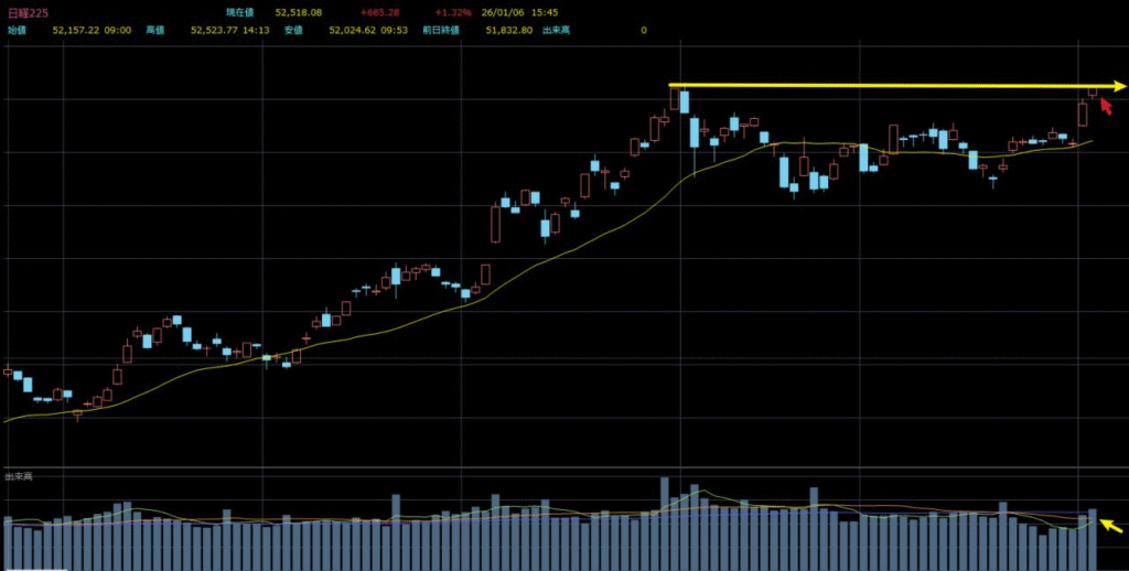 一方で、日経平均は再び前回高値水準に近づいており、明確なレジスタンスラインが意識される局面に入っています。