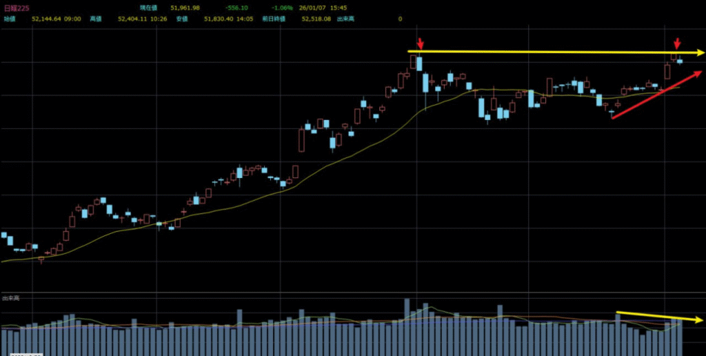 株式取引の本質は、「相場を予測したうえで売買を行うこと」です。投資家が株を買うのは将来の値上がりを期待しての行動であり、逆に「これから下落する」というトレンドが市場の共通認識となった場合、取るべき行動は何かと言えば、言うまでもなくリスク回避を目的とした先行的な売却です。だからこそ私は、直近の上昇局面を「買いのチャンス」と捉えるのではなく、むしろ「売りを検討すべきタイミング」であると、繰り返し強調しています。