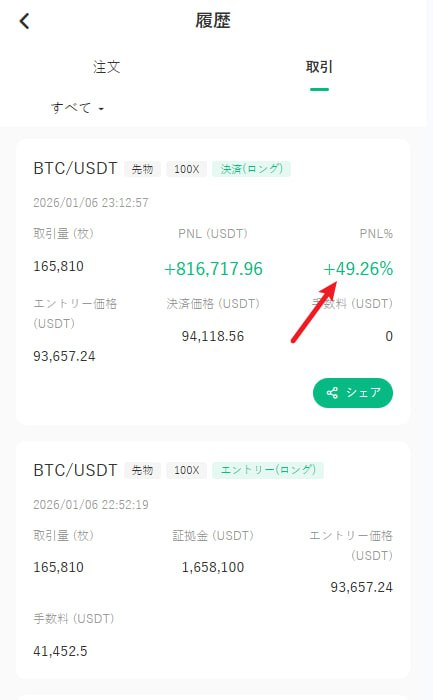 この分析に基づき、2回目の取引ではロングでエントリーしました。その後、相場は想定通りに急速な上昇を見せ、この取引では49.26%の利益を上げる結果となりました。