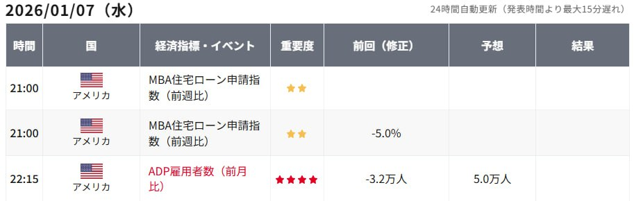算出方法が政府統計と比較的近いことに加え、本番となるNFPよりも2日早く公表されるため、金曜日に向けた重要な先行指標として市場から注目されています。現在の市場予想は「5万人増」です。結果が予想を上回ればドルにとって好材料となり、反対に下回った場合はドル売りの要因となります。