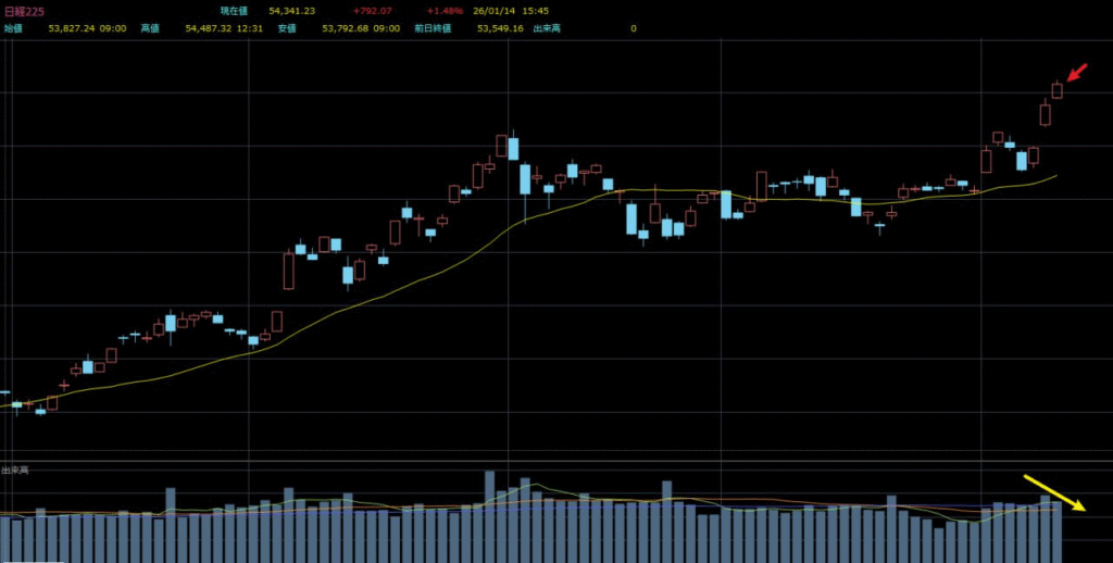 ただし、出来高は明らかに減少しており、投資家の慎重姿勢が強まっていることが読み取れます。