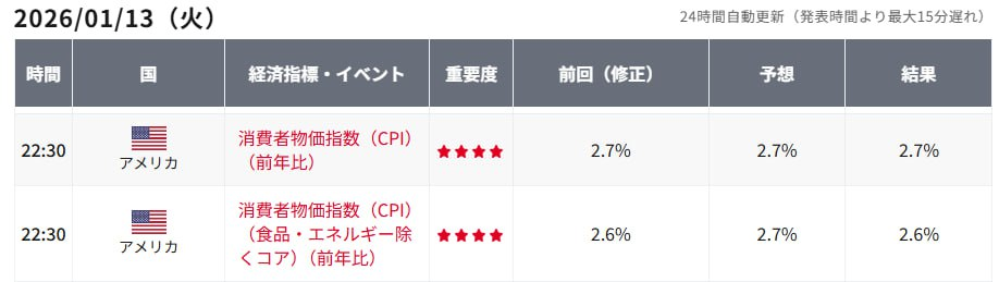 昨夜、米労働省が発表した12月の消費者物価指数(CPI)は、コアCPIが前年同月比で+2.6%となり、市場予想の+2.7%を下回りました。
