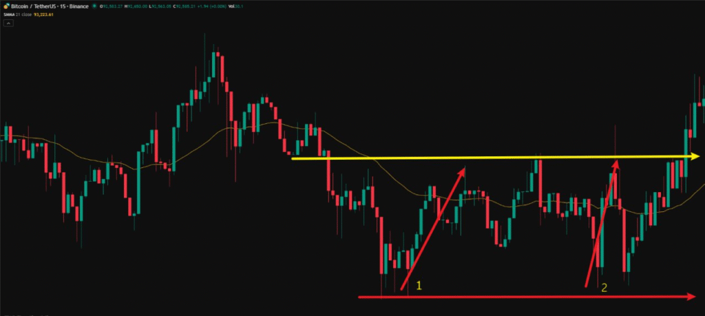 最安値ではなく、反発後の2本目のローソク足を基準に計算すると、ロングのエントリー価格は94,929ドルとなり、その後、価格は95,376ドル付近まで上昇しました。