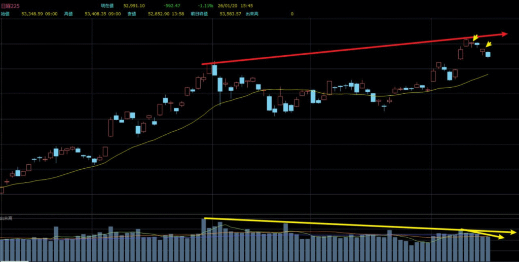 午後に入ると、円安の進行を背景に一時的に値を戻す場面も見られましたが、買いの勢いは弱く、引けにかけて再び下落しました。