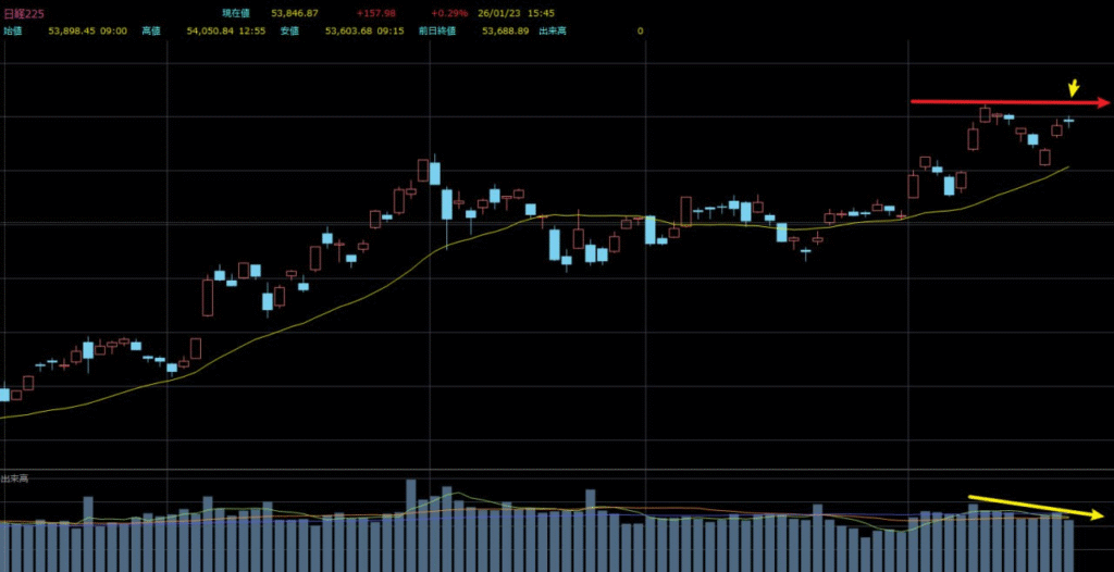 加えて、出来高も減少傾向にあり、買い側の姿勢が徐々に慎重になってきている様子がうかがえます。