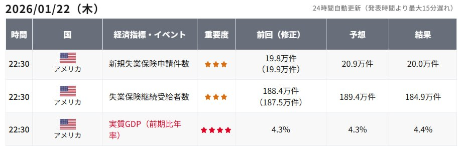 昨夜、米労働省が発表したデータによりますと、1月17日までの週の新規失業保険申請件数は20万件となり、前週から1,000件増加したものの、市場予想の20.9万件を下回りました。