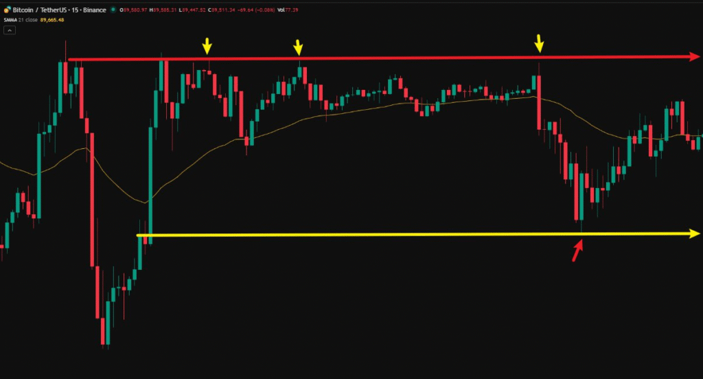 15分足チャートをご覧いただければわかる通り、テクニカル的に価格が直近のレジスタンスラインに到達していたため、短期的なレンジ相場における「高値でショート、安値でロング」という戦略で進めることができます。