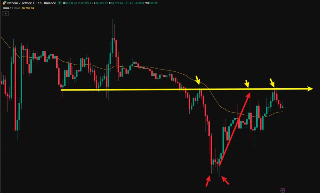 日足チャートを見ると、昨日の安値は86,508ドル付近で下げ止まり、重要なサポートラインに到達することなく落ち着いた動きを見せた後、反発へと転じました。