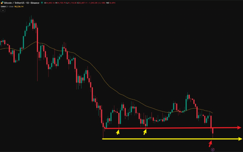 80,600ドルから85,000ドルの価格帯は、ここ2ヶ月間の重要なサポートゾーンとなっており、価格がこの水準に達したことは、レンジ相場の底に近づいたことを意味します。