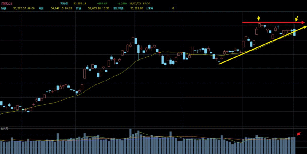 チャート上では、寄り付きの勢いを打ち消して下落する「陰の包み足」を形成しており、典型的な弱気シグナルです。