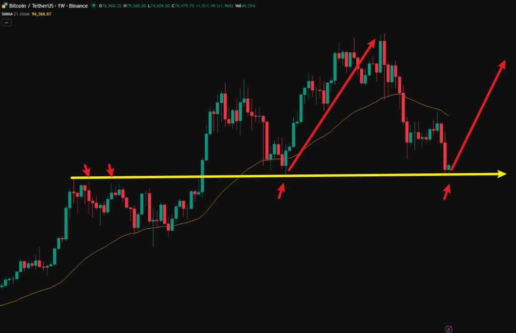 週足チャート(図参照)で実際の値動きを見ると、昨日は一時74,604ドルまで下落しましたが、重要なサポートに到達した後、すぐに下げ止まり、反発に転じました。