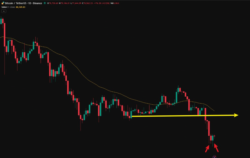 現在、20日移動平均線は85,850ドル付近に位置している一方で、ビットコインの価格は78,586ドル前後で推移しています。