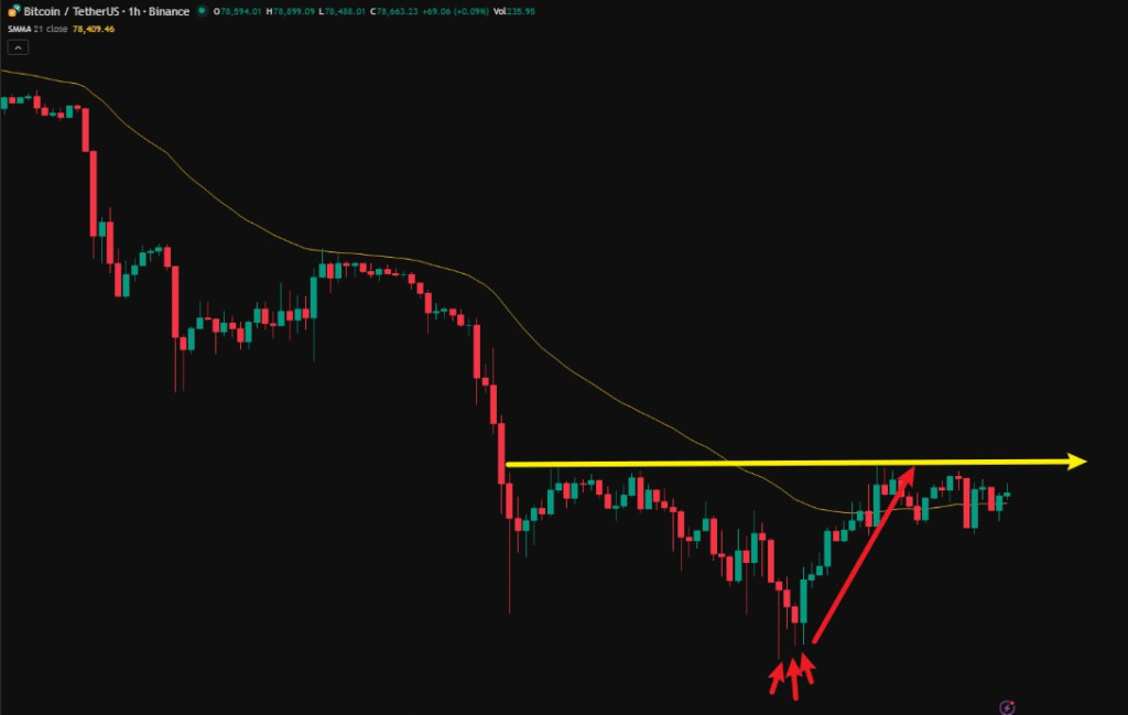 上昇直前のビットコイン価格はおおよそ75,000ドル付近で、その後、一時79,360ドルまで上昇しました。