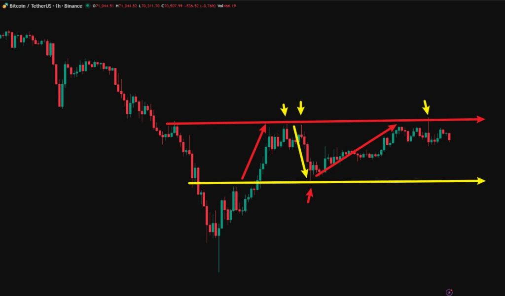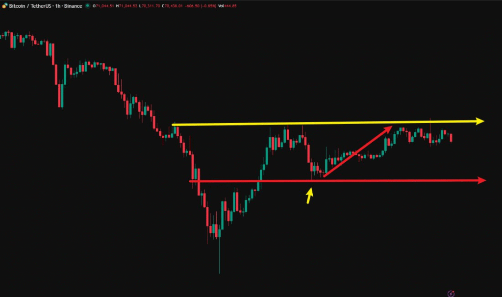 60分足チャートを見てみると、週末には一時67,300ドル付近まで押し戻されましたが、先ほどの重要なサポートゾーンに到達した後は、すぐに下げ止まり、反発に転じています。