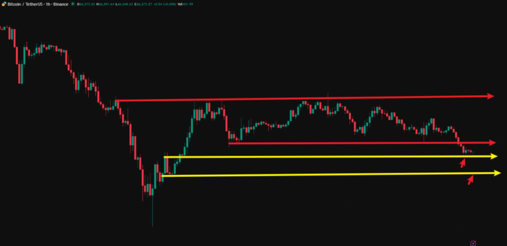 価格が65,700ドル〜66,500ドルまで下落し、下ヒゲの陰線や陽線が出たところでロングポジションを入れ、利確目標は72,000ドル付近に設定します。