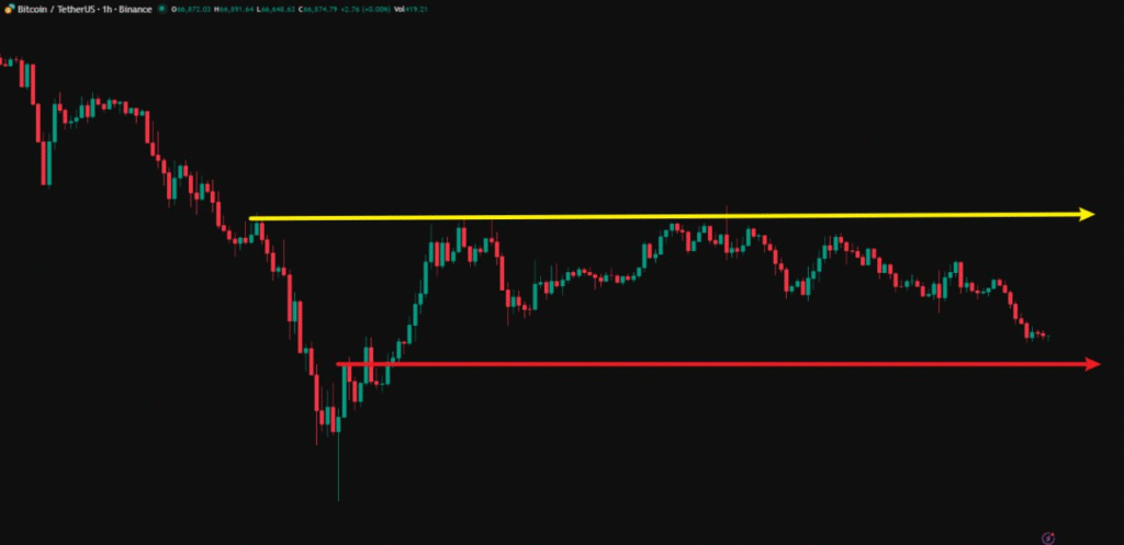 したがって、ビットコインは再びレンジ相場を形成し、想定レンジは下限が66,500ドル付近、上限が72,000ドル付近となります。