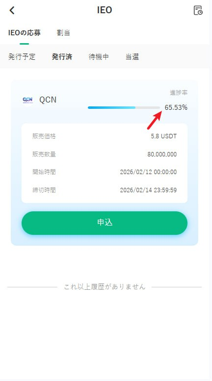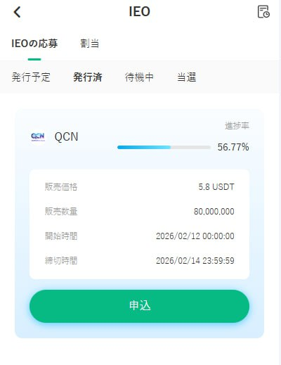 今回のQCNを例に挙げますと、申込価格は5.8USDT(約5.8ドル)、発行枚数は8,000万枚ですので、プロジェクト側が市場から調達を目指している資金総額は4億6,400万ドルとなります。