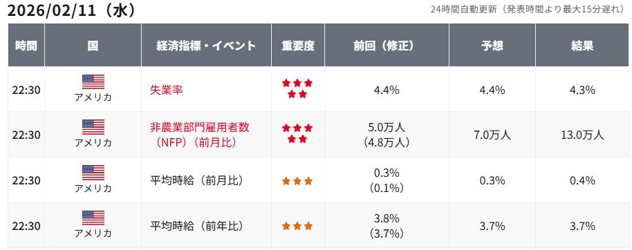 昨夜、米労働省の発表によりますと、1月の非農業部門雇用者数は13万人増となり、市場予想の7万人増を大きく上回りました。