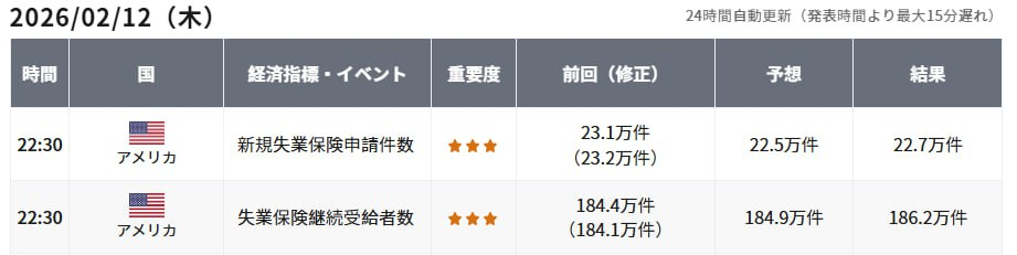 昨夜、米労働省が発表したデータによりますと、2月7日までの週の新規失業保険申請件数は前週比5,000件減の22万7,000件となり、市場予想の22万5,000件をやや上回りました。