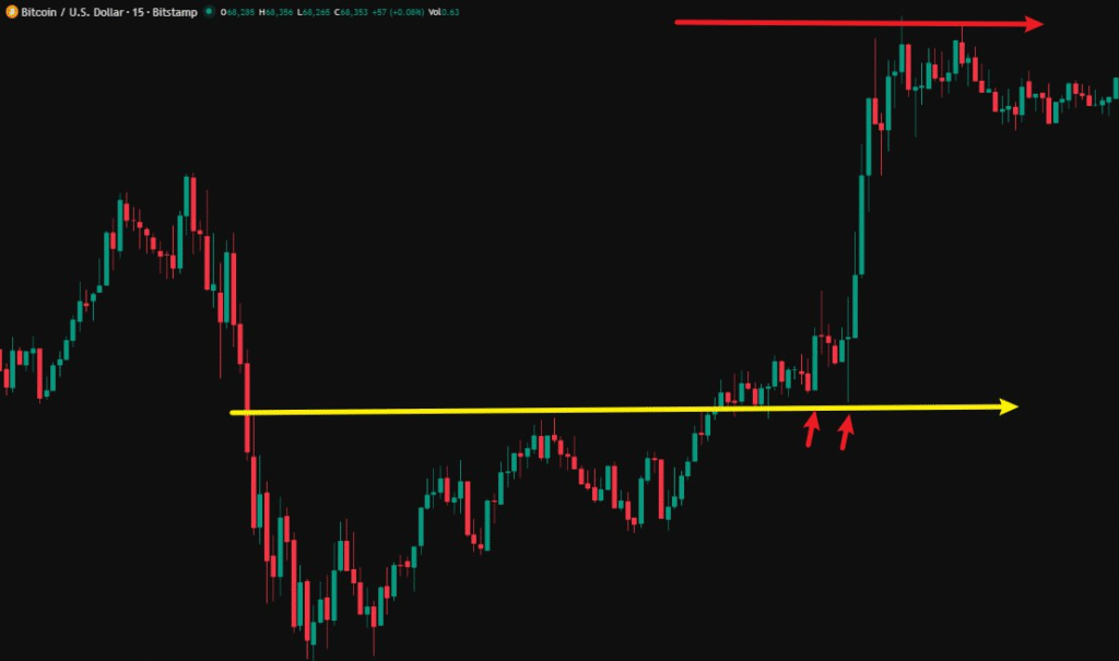 およそ1時間後、下値を切り上げながら買いが優勢となり、価格は上昇に転じました。そして前回のレジスタンスラインである69,300ドル付近に到達したタイミングで利益確定を行い、最終的な収益率は126%となりました。