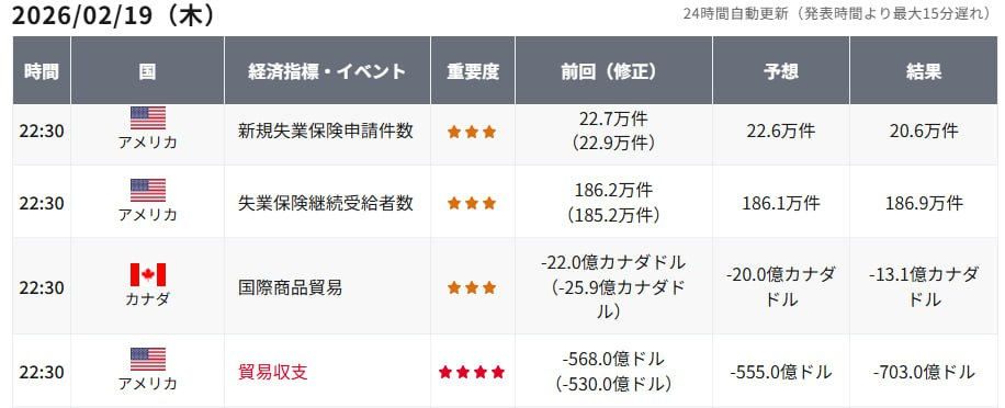 昨夜、米労働省が発表したデータによると、2月14日までの週の新規失業保険申請件数は前週比2万3,000件減の20万6,000件となり、市場予想の22万6,000件を大きく下回りました。
