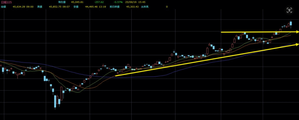 まず、株高は資金の流入なしには続きません。先週、米国は政策金利を25ベーシスポイント引き下げ、さらに年内に2回の追加利下げを見込むと発表しました。これは投資家にとって大きな好材料であり、FRBの金融政策が緩和局面に入ったことを示しています。その結果、市場の流動性は一段と潤沢となり、米国株は高値更新を続けています。日本株にとっても、これは明確にポジティブなシグナルです。