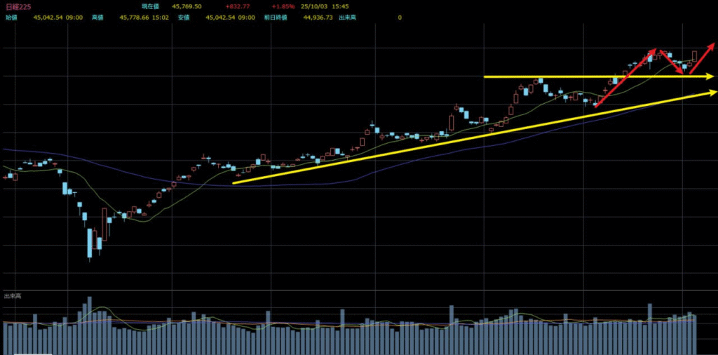 以前にもお伝えしたとおり、今回の日本株の上昇は「円安」と「テクノロジー/AIテーマの拡大」という二つの主軸に大きく支えられてきました。したがって、円高が3日続いた局面では、日経平均もそれに連動して3日続落となりました。
